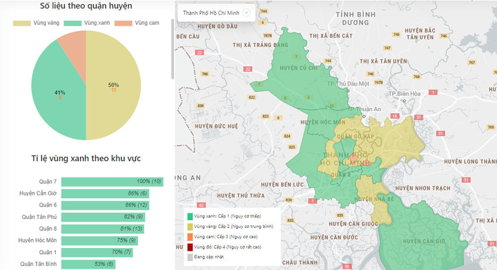 Ở cấp quận, huyện có 10/22 địa phương đạt cấp 1 là vùng xanh - nguy cơ thấp, gồm các quận 3, 6, 7, 8, Tân Bình, Tân Phú, huyện Bình Chánh, Cần Giờ, Củ Chi và Hóc Môn.
