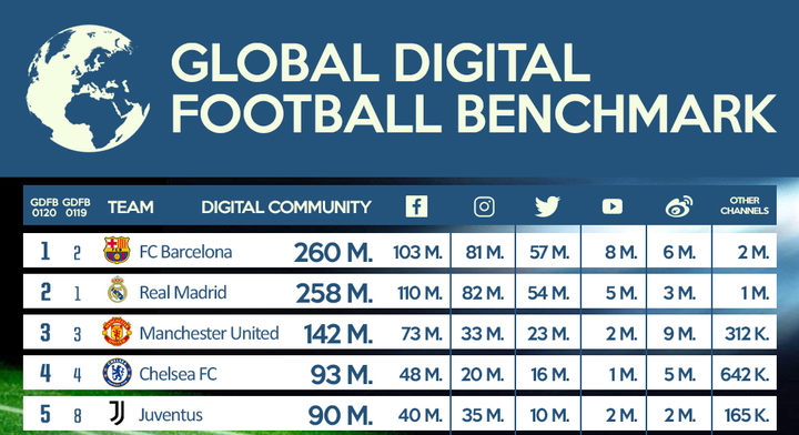 Tháng 1/2020, RESULT Sports , một tổ chức chuyên về tiếp thị và truyền thông kỹ thuật số cho các vận động viên, CLB, giải đấu, Liên đoàn, nhà tài trợ, đã đưa ra danh sách về lượng người theo dõi các CLB trên các phương tiện truyền thông xã hội.
