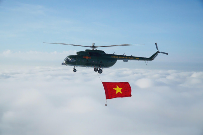 Biên đội trực thăng mang theo cờ Đảng và cờ Tổ quốc bay trên Quảng trường Ba Đình chào mừng Quốc khánh 2/9.