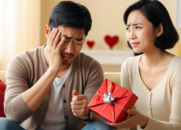 Vợ luôn đòi quà Valentine đắt tiền để sống ảo nhưng rồi lại đem bán trên mạng. (Ảnh: AI)