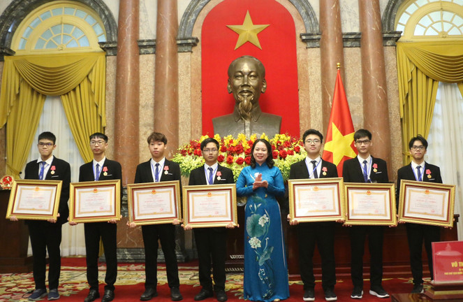 16 học sinh đoạt huy chương vàng, bạc các môn thi Olympic quốc tế 2023 nhận huân chương Lao động hạng Nhất, Nhì, Ba của Chủ tịch nước.
