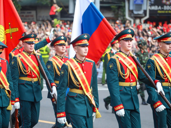 33 tiêu binh thuộc Trung đoàn 154 Preobrazhensky – đơn vị danh dự của Quân đội Nga vẫy chào Nhân dân Việt Nam sau buổi diễu binh sáng 2/9.