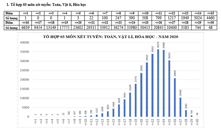 Kết quả phân tích điểm thi theo tổ hợp 3 môn xét tuyển Toán, Vật lí, Hóa học cho thấy: Điểm trung bình là 21,46 điểm, điểm trung vị là 21,9 điểm; tổng điểm có nhiều thí sinh đạt nhất là 23 điểm.
