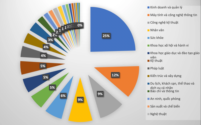 Nhóm ngành Kinh doanh và quản lý cao nhất khoảng 25% số thí sinh đã nhập học đại học. Tiếp đến ngành Máy tính và công nghệ thông tin (chiếm 12%), Công nghệ kỹ thuật, Nhân văn (chiếm 9%) Sức khoẻ (6%).