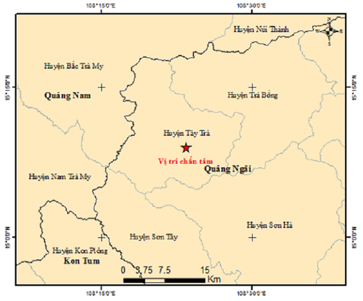 Vị trí tâm chấn của trận động đất thứ 2 xảy ra ở huyện Tây Trà. (Ảnh: Viện Vật lý Địa cầu)