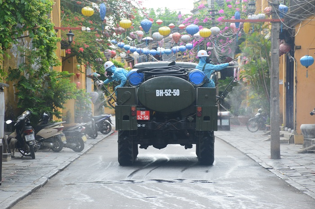 Bộ Quốc phòng phối hợp Quân khu 5 triển khai lực lượng 6 xe chuyên dụng của quân sự cùng 32 quân nhân phun tiêu độc khử trùng phố cổ Hội An.