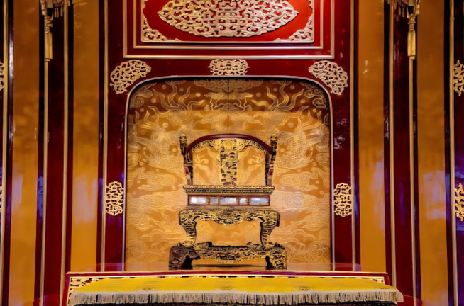 Bảo vật quốc gia Ngai vua triều Nguyễn được trưng bày tại Điện Thái hòa (Đại nội Huế) trước khi bị Hồ Văn Phương Tâm lẻn vào phá hoại. (Ảnh: Hoàng Lê)