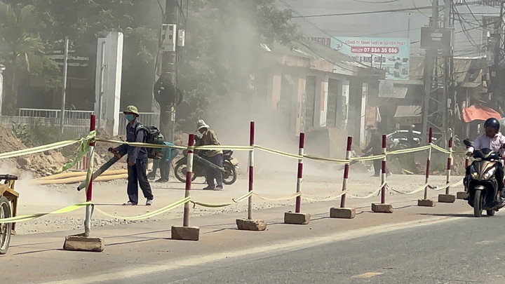 Ghi nhận của PV VTC News, lúc 14h ngày 20/4 tại đường Phạm Văn Đồng đoạn gần Trường nghiệp vụ Thuế phân hiệu tại Thừa thiên - Huế, một nhóm công nhân đang dùng máy thổi bụi làm sạch bề mặt đường trước khi rải nhựa. Hoạt động này khiến bụi bay mù mịt.