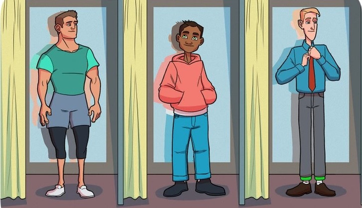 Có 3 người đàn ông ghé cửa hàng thời trang để mua sắm. Tuy nhiên, nhân viên kiểm tra thấy một chiếc quần màu xanh lá cây đã bị mất. Trong số 3 người đàn ông bên dưới, đâu là kẻ trộm?