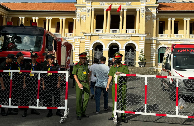 Lực lượng chức năng đảm bảo an ninh quanh khu vực tòa án, chỉ những người được cấp thẻ mới có quyền ra vào phiên tòa xét xử 254 bị cáo trong đại án đăng kiểm.