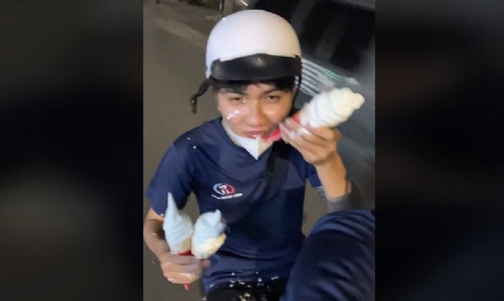 Ngồi trên xe máy mà tham lam ăn một lúc 3 cây kem ốc quế, không biết cái quần của chàng trai này sẽ còn thảm đến mức nào khi về đến nhà.