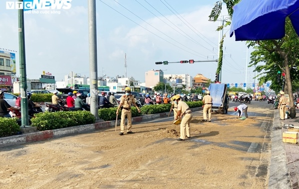 Nhiều người dân gần đó cũng ra hỗ trợ lực lượng CSGT. Sau khoảng 1 giờ, mặt đường có dầu đã được CSGT phủ kín cát, giúp người đi đường không bị trơn trượt.