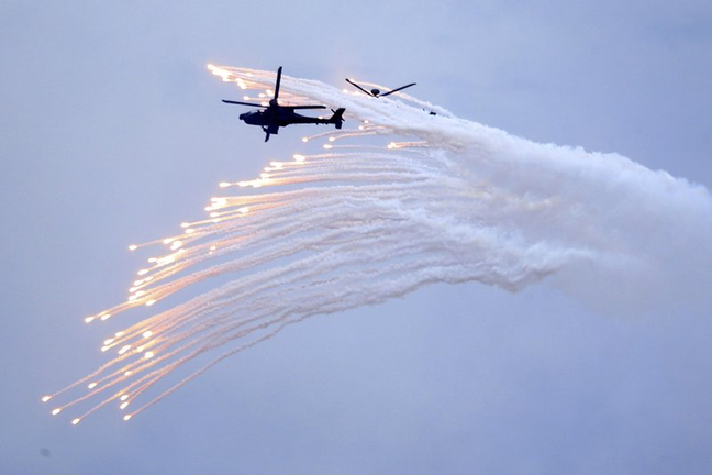 Máy bay trực thăng tấn công AH-64E Apache của Đài Loan phóng pháo sáng, (Ảnh: AP)