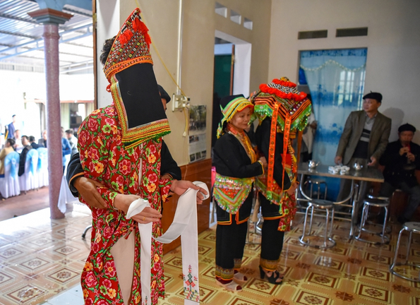 Cô dâu, chú rể đều che kín mặt, có người đứng sau hỗ trợ thực hiện nghi lễ.