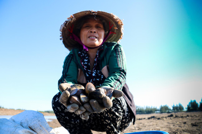 “Mùa này thủy triều thường rút vào khoảng 9- 15h, nên hầu như chúng tôi làm việc xuyên trưa. Nắng nóng rất vất vả, nhưng mấy năm nay ngao biển được giá nên chúng tôi cố gắng làm cho con cái có thêm tiền ăn học”, chị Nguyễn Thị Hoa (32 tuổi) chia sẻ.