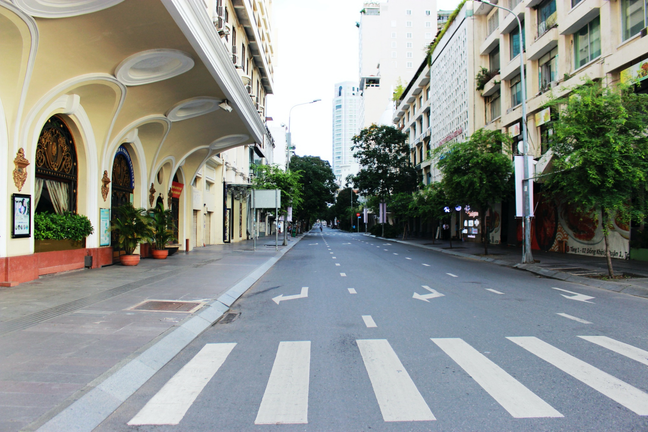 Đường Đồng Khởi (quận 1, TP.HCM) bình yên trong ngày đầu giãn cách xã hội theo Chỉ thị 16.