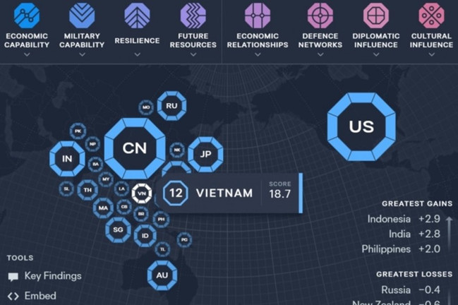 Đáng chú ý, trong bảng xếp hạng này, Việt Nam được đánh giá là quốc gia tầm trung. Mặc dù so với năm 2023, vị trí trên bảng xếp hạng vẫn giữ nguyên là 12 nhưng ảnh hưởng của Việt Nam đang gia tăng trong khu vực khi tăng 1,2 điểm. Trong đó, mức độ ảnh hưởng của Việt Nam được thể hiện rõ nhất qua lĩnh vực ngoại giao, nguồn lực tương lai và quan hệ kinh tế. Trong đó ảnh hưởng về ngoại giao, văn hóa và nguồn lực tương lai có nhiều tiến bộ và được thăng hạng với mức tăng lần lượt là 3,3 điểm, 1,9 điểm và 1,8 điểm.