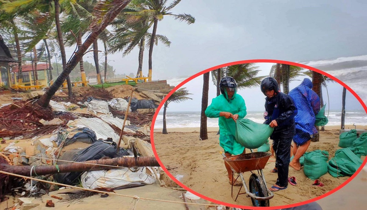 Ảnh: Mưa to, sóng lớn cuộn trào, người dân hối hả 'vá' bờ biển Hội An