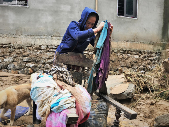 Bà Vang Thị Bình (63 tuổi) nhặt lại đống quần áo của gia đình từ trong bùn đất.
