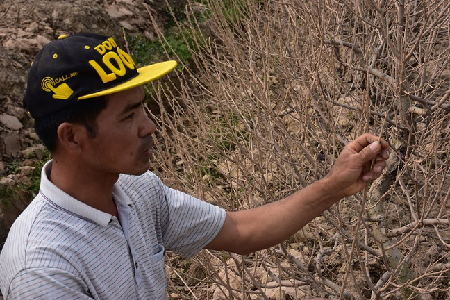 Gia đình ông trồng đào từ nhiều năm nay, tuy nhiên, đây là năm đầu tiên những gốc đào bị ảnh hưởng nặng nề như thế.