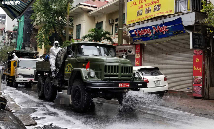Ảnh: Quân đội phun khử trùng phố Trúc Bạch trong ngày đầu cách ly Covid-19