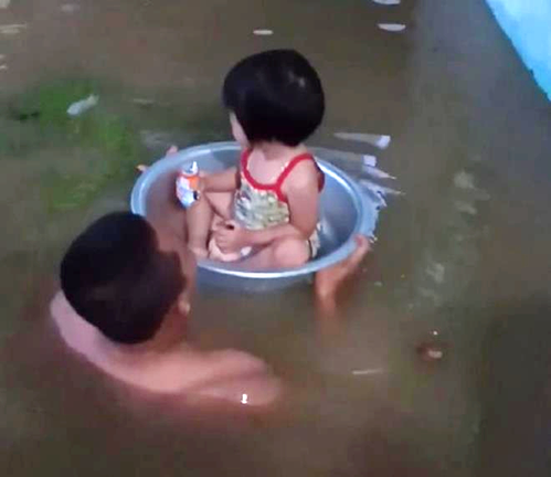 Người dân ở khu 7, phường Cao Thắng cho biết, nước dâng cao khiến nhiều người phải cho con lên chậu để đi sơ tán. (Ảnh: CTV)