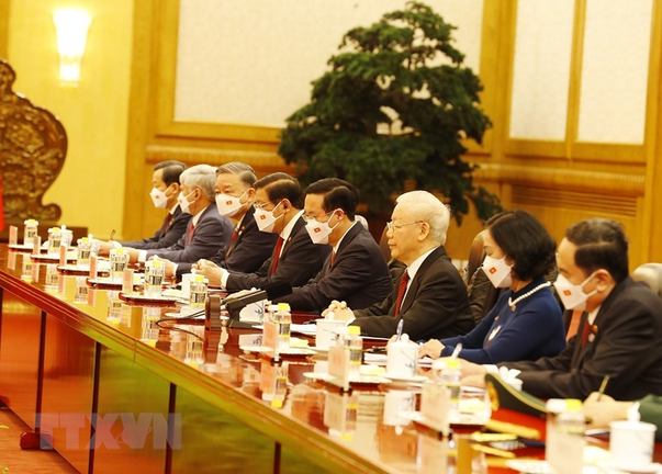 Tổng Bí thư Nguyễn Phú Trọng hội đàm với Tổng Bí thư, Chủ tịch Trung Quốc Tập Cận Bình. (Ảnh: Trí Dũng/TTXVN)