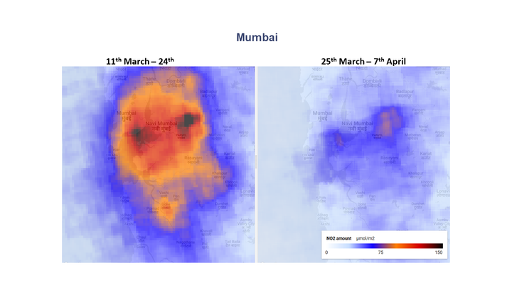 Hình ảnh trước và sau lệnh phong tỏa cho thấy khí thải nitơ dioxide (biểu thị bằng màu cam) ở các thành phố Mumbai, New Delhi, Bengalaru, Chennai và Hyderabad gần như biến mất.