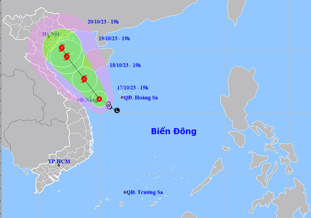 Khoảng 19h ngày 19/10, bão trên vùng biển phía Nam Vịnh Bắc Bộ, di chuyển theo hướng Bắc Tây Bắc, tốc độ khoảng 10 km/h.