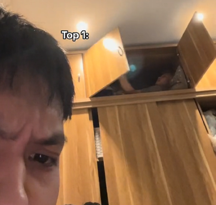 Giận bạn trai mà leo tít lên ngăn tủ sát trần nhà để nằm như cô gái trong clip thì người yêu nào mà đỡ cho nổi.