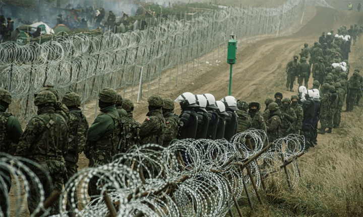 Cảnh sát và binh sĩ Ba Lan giám sát người di cư ở biên giới với Belarus đoạn gần làng Kuznica tháng 11/2021. (Ảnh: Reuter)
