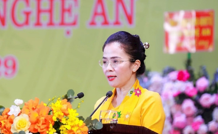 Lãnh đạo Thường trực Tỉnh ủy Nghệ An tặng hoa chúc mừng bà Võ Thị Minh Sinh. (Ảnh NTV)