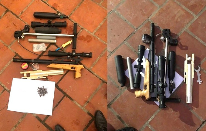 Khám xét khẩn cấp nơi ở của hai người này, lực lượng chức năng thu giữ 2 khẩu súng quân dụng (loại súng khí nén PCP), 229 viên đạn cùng nhiều linh kiện lắp ráp súng PCP.