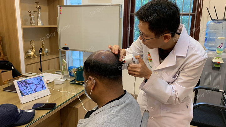 Dr Duy Thành đang kiểm tra nang tóc cho bệnh nhân.
