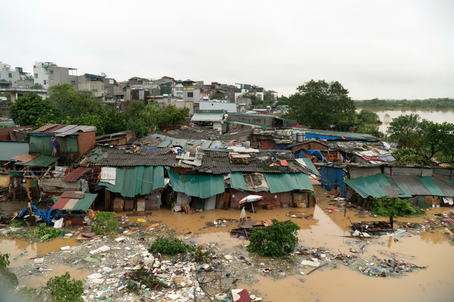 Sáng 10/9, nước dâng cao ở khu vực bãi bồi sông Hồng. Hầu hết các ngôi nhà tạm ở đây đều ngập ngang nhà.