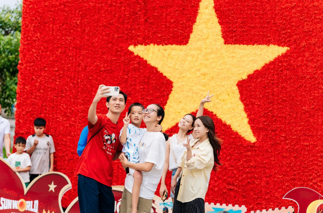 Tại Sun World Ha Long - trái tim giải trí của Bãi Cháy, dọc từ cổng công viên Rồng đến đồi Mặt Trời, hàng trăm lá cờ đỏ sao vàng tung bay rợp trời, nổi bật là đại kỳ khổng lồ kết từ hàng ngàn đóa hoa đỏ và vàng, nơi gần như không lúc nào vắng bóng du khách tới check-in.