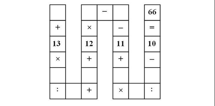 Hãy điền các số từ 1 đến 9 vào các ô trống còn thiếu trong hình. Sử dụng các phép toán đã được xác định và các giá trị được chèn vào, ta có kết quả cuối cùng là 66.