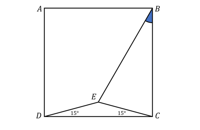 Giả sử ABCD là hình vuông. E nằm trong hình vuông sao cho các góc EDC = ECD = 15 °. Tìm số đo của góc EBC?