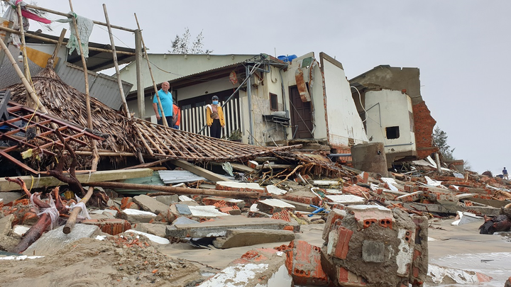 Bão số 13 quét qua, dãy nhà chuyên kinh doanh hải sản phục vụ du khách bên bãi biển Hội An bị sóng “nuốt chửng” trong sự bất lực và nỗi sợ thất thần của người dân.