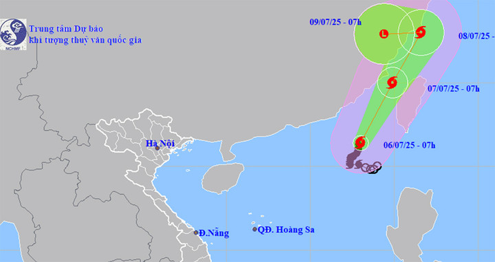 Dự báo đường đi, khu vực ảnh hưởng của bão số 2 lúc 7h ngày 6/7. (Nguồn: NCHMF)