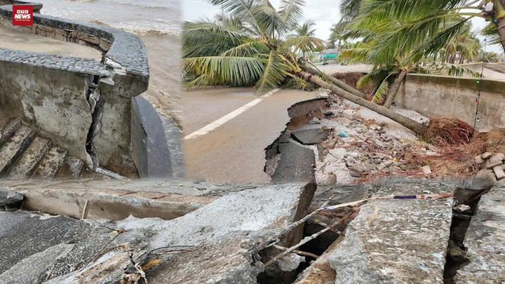 Sau bão số 5 bờ kè biển Hải Tiến xã Hoằng Tiến, Thanh Hóa bị nứt toác trơ lõi sắt thép, đường bị sụt lún, cây cối đổ.