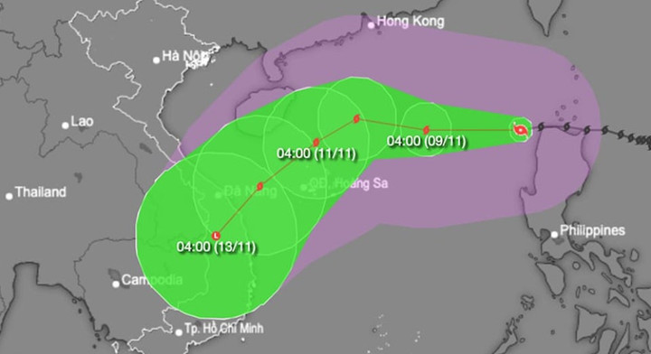 Khoảng 4h ngày 10/11, bão cách quần đảo Hoàng Sa khoảng 330km về phía Bắc Đông Bắc, đổi hướng Tây Tây Bắc, tốc độ khoảng 10-15km/h, suy yếu dần. Sức gió mạnh nhất vùng gần tâm bão mạnh cấp 12-13, giật cấp 16.