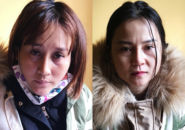 Nguyễn Thị Hương (lề trái) và Đặng Thị Thu Hương tại cơ quan điều tra.