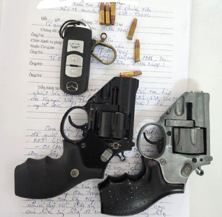 Kiểm tra xe ô tô trên, trinh sát phát hiện bên trong xe có 2 khẩu súng ngắn kiểu Rulo cùng 6 viên đạn. Qua làm việc, Nguyễn Văn Thành khai nhận đã mua 2 khẩu súng này trên mạng vào năm 2022 về để sử dụng với mục đích "phòng thân".