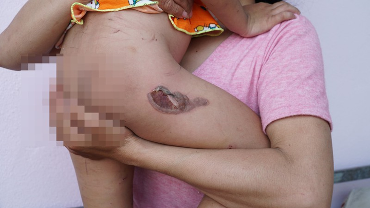 Vết bỏng nặng trên đùi bé P. do bị Tâm dí vào bô xe máy.