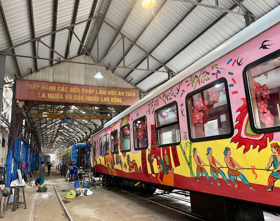 Những công nhân của Xí nghiệp Sửa chữa toa tàu đang hoàn thiện công đoạn trang trí, giúp hai toa tàu trở nên đặc biệt, mang đậm không khí Tết.
