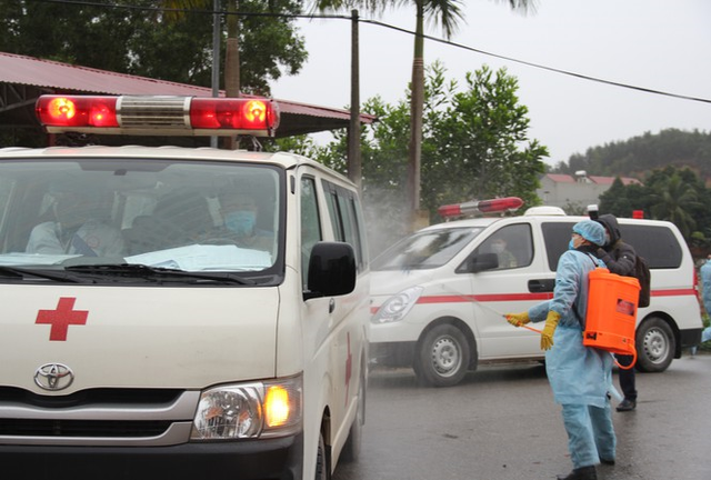 Xe vận chuyển người nghi mắc COVID - 19 ở tỉnh Bắc Giang đi cách ly tập trung.