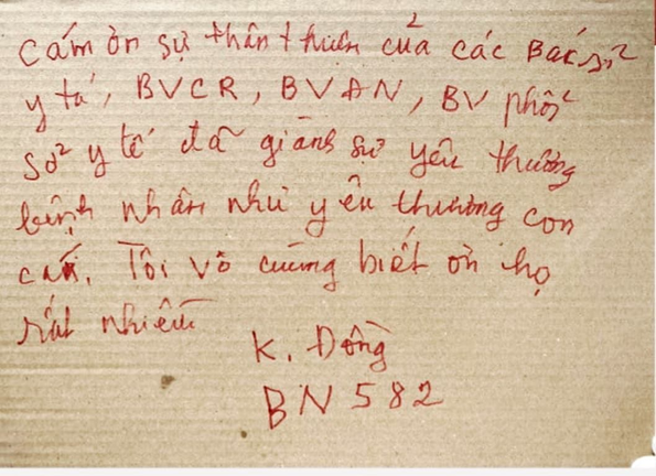 Trên tấm bìa các tông, bệnh nhân 582 viết: “Cám ơn sự thân thiện của các bác sĩ, y tá, Bệnh viện Chợ Rẫy, Bệnh viện Đà Nẵng, Bệnh viện Phổi, Sở Y tế đã dành sự yêu thương bệnh nhân như yêu thương con cái. Tôi vô cùng biết ơn họ rất nhiều”.