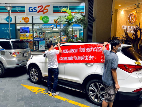có khoảng 10 xe ô tô được căng băng rôn với các nội dung: "Phản đối Phát Đạt bán ô đậu xe tại chung cư", "Phát Đạt thực hiện sai cam kết trong hợp đồng mua bán với người mua về hầm đậu xe chung cư"...