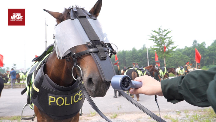 Thời tiết nắng nóng, mưa dông thất thường khiến ngựa dễ bị oi bức, các chiến sĩ đã linh hoạt dùng quạt mini ngay tại thao trường để làm mát cho ngựa.